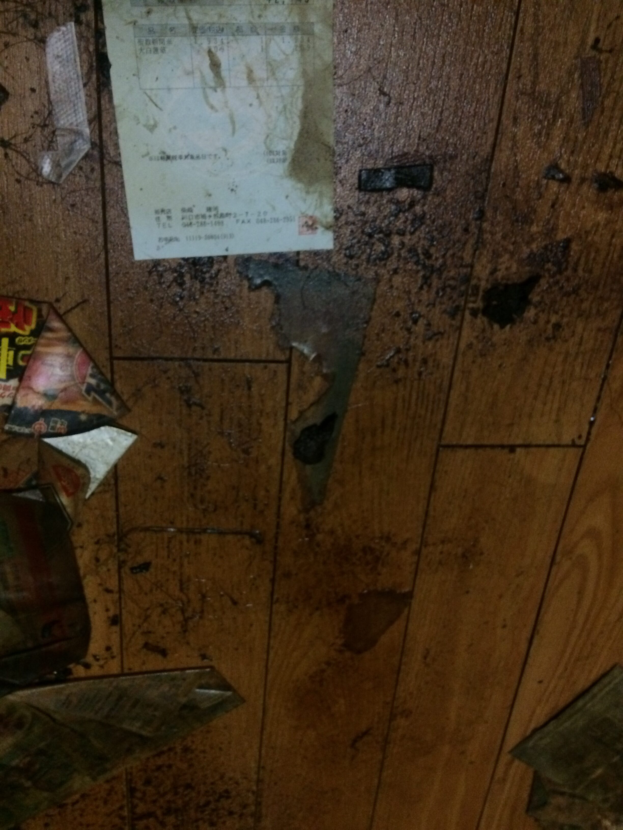 入室直後から強い腐敗臭で室内が充満しており、残された血液から腐敗臭が発生していました。蛆の死骸も大量に残されている状態でした。
