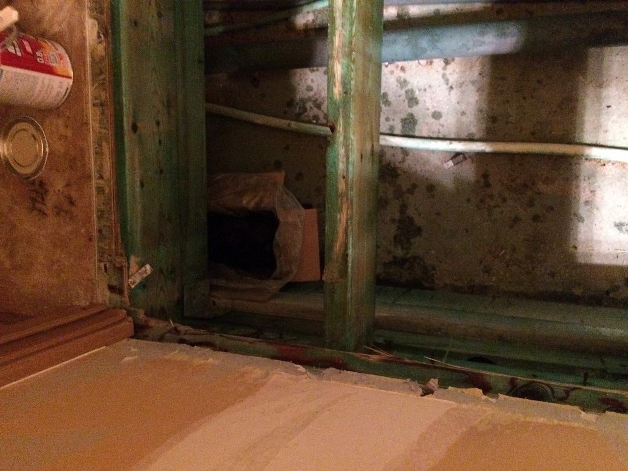 キッチン前で亡くなられており死後2週間程度。消毒、汚染個所の除去、家財の搬出後に消臭作業を行ったのですが、わずかに臭いが残り続けます。汚染個所からは異臭は無いのですが部屋を閉め切ると異臭が再発しています。わずかな臭いのためクッションフロアやクロスの張替えで臭いが無くなるから大丈夫とオーナー様はおっしゃってますが、やはり気になりますので徹底的に調べました。原因は床下の断熱材に腐敗臭が浸透しており、少しづつ部屋に籠るということがわかり、床面の全解体を行いました。