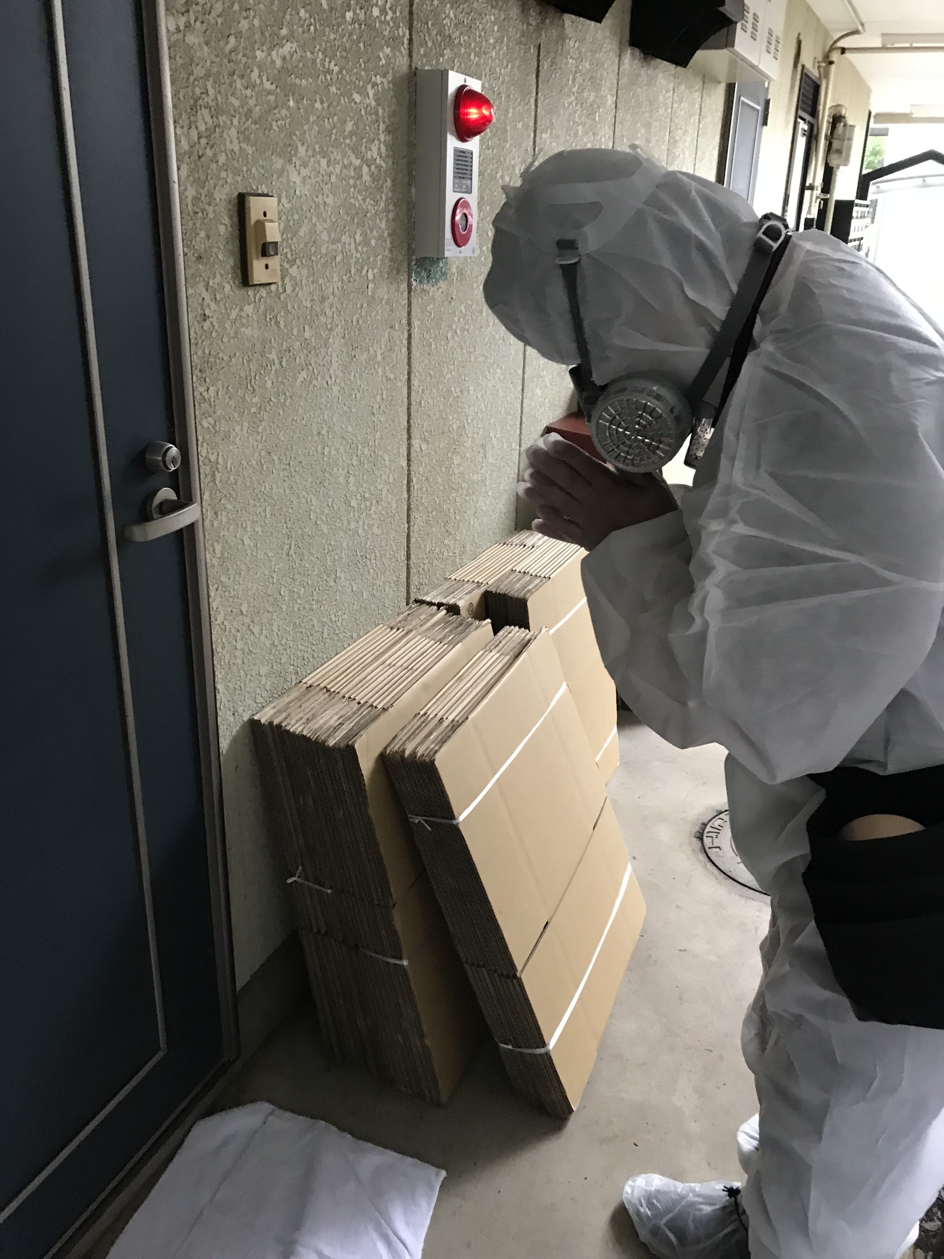 しかしむやみに部屋に入室するのはおすすめできません。感染症や足跡から汚染を屋外に持ち出す可能性もあるためです。便利サイクルでは防護服や除菌の準備をしてから入室を行います。