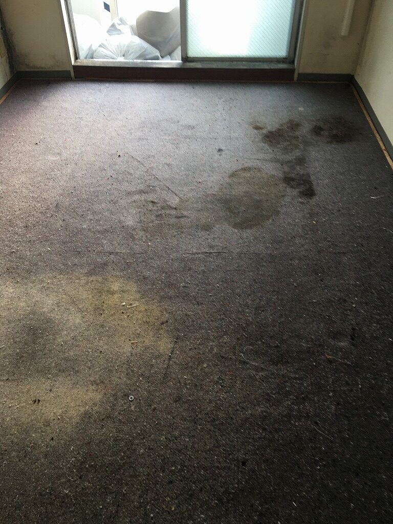 遺体を運び出した際にでた血液や体液が通路まで広がっており、玄関から屋外まで臭いが漏れ出している状況でした。