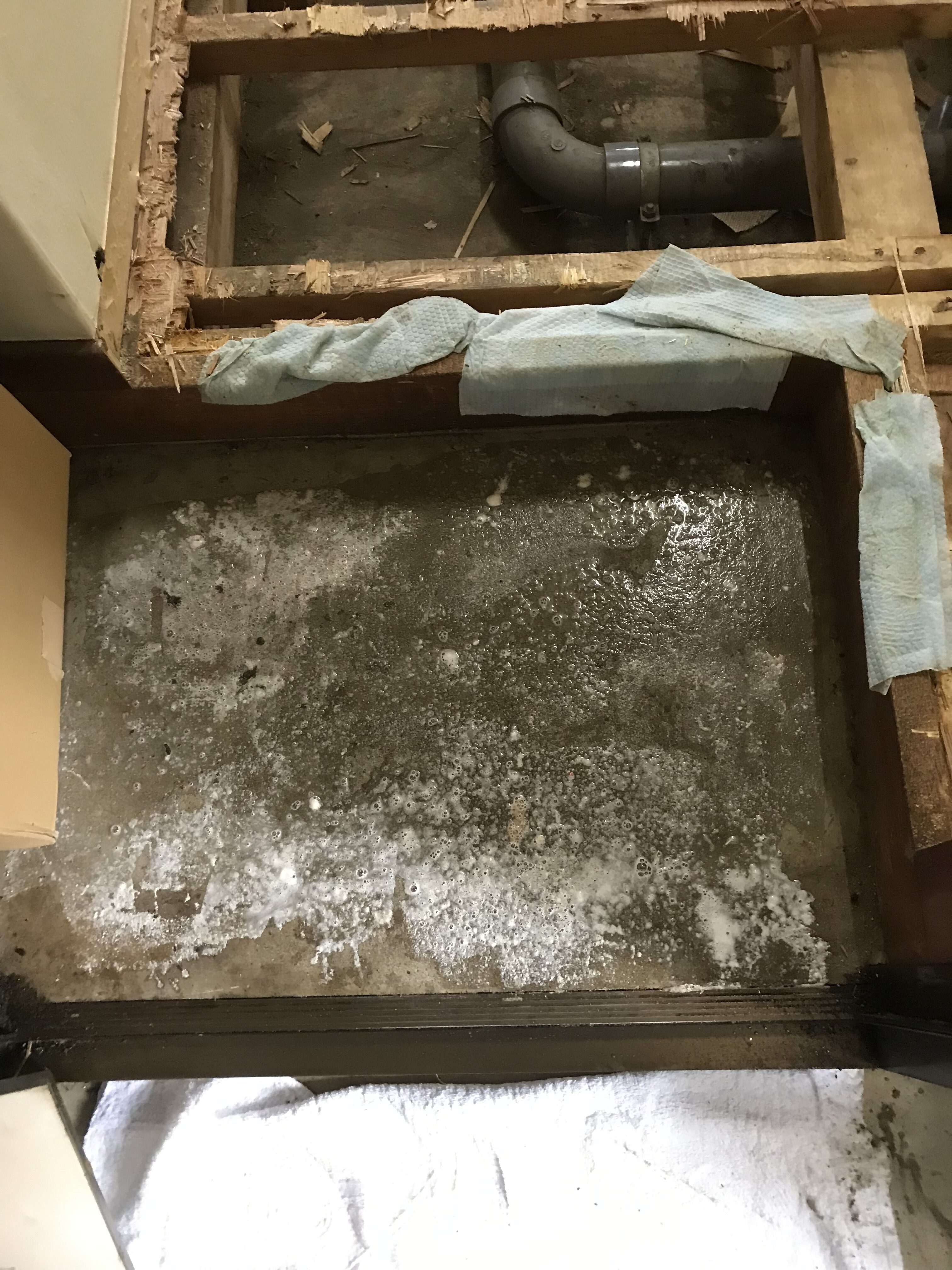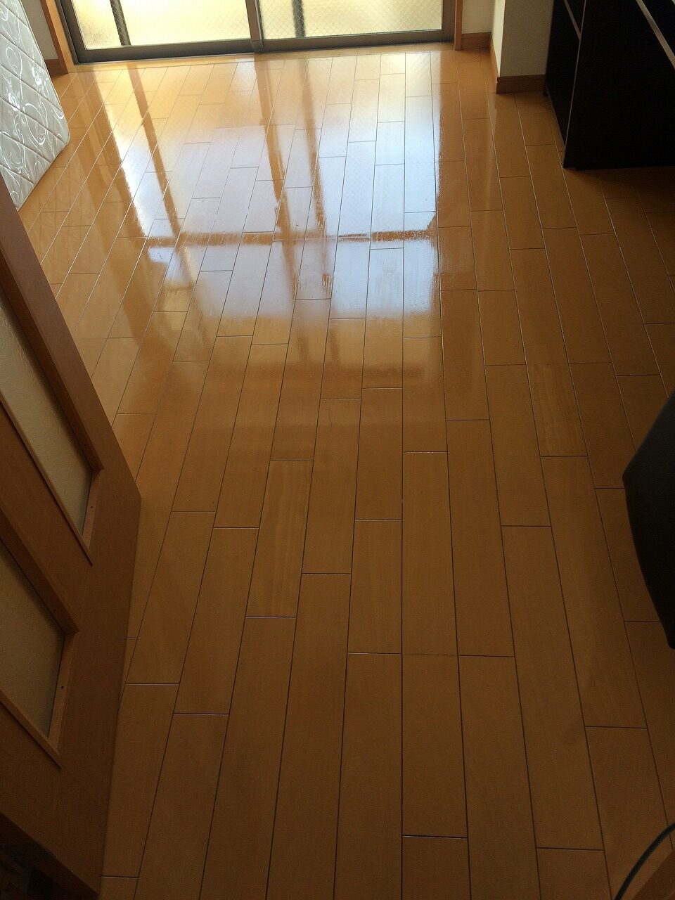 床面はクッションフロアでしたの、一部をめくり薬剤による体液反応を確認すると巾木と床材の隙間から反応がでたため現状を伝え翌日から施工に入りました。