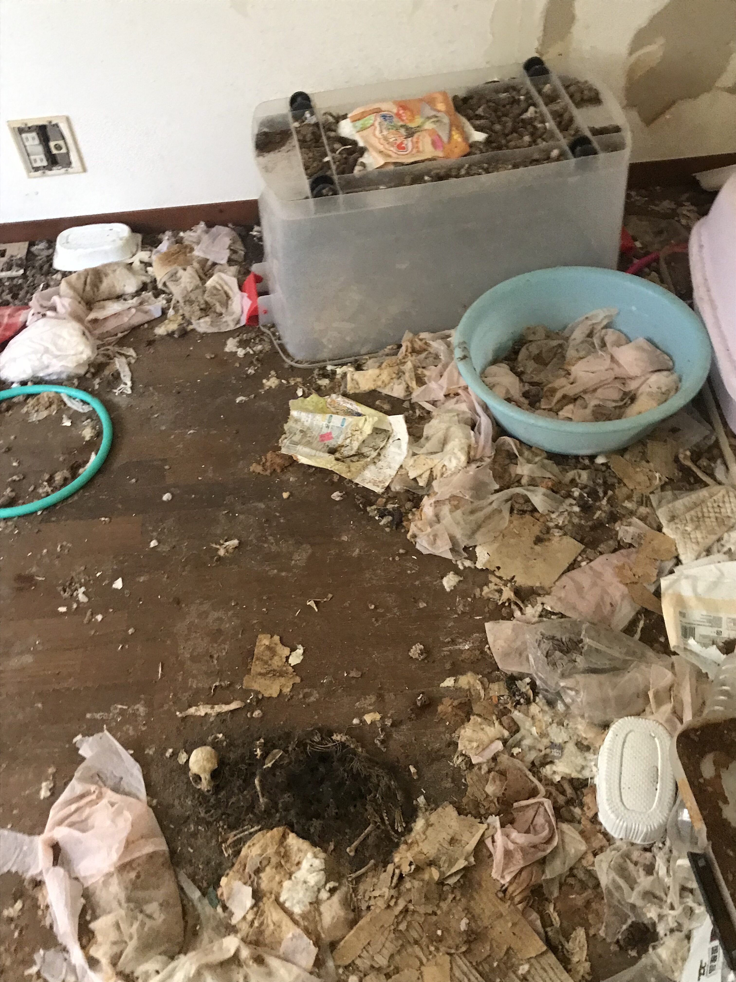 以前住んでいた住人が室内でペットを飼っており臭いがひどく、ゴミであふれているので片付けをお願いしたいとのことでした。