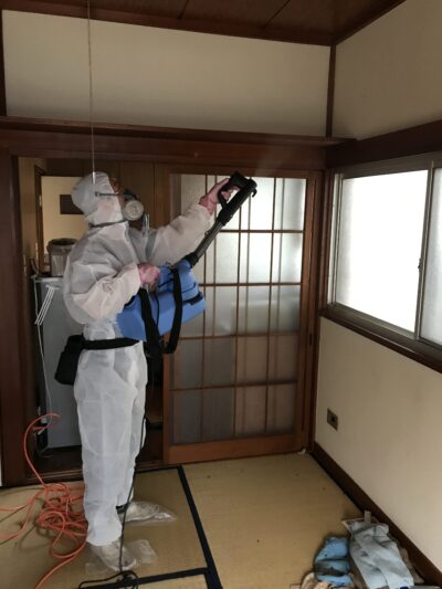 大量のゴミに加えて電気や水道、ガスも止まっており、建物自体も古く襖や木枠等にも臭いが残り、通常よりも異臭が残る現場でした。