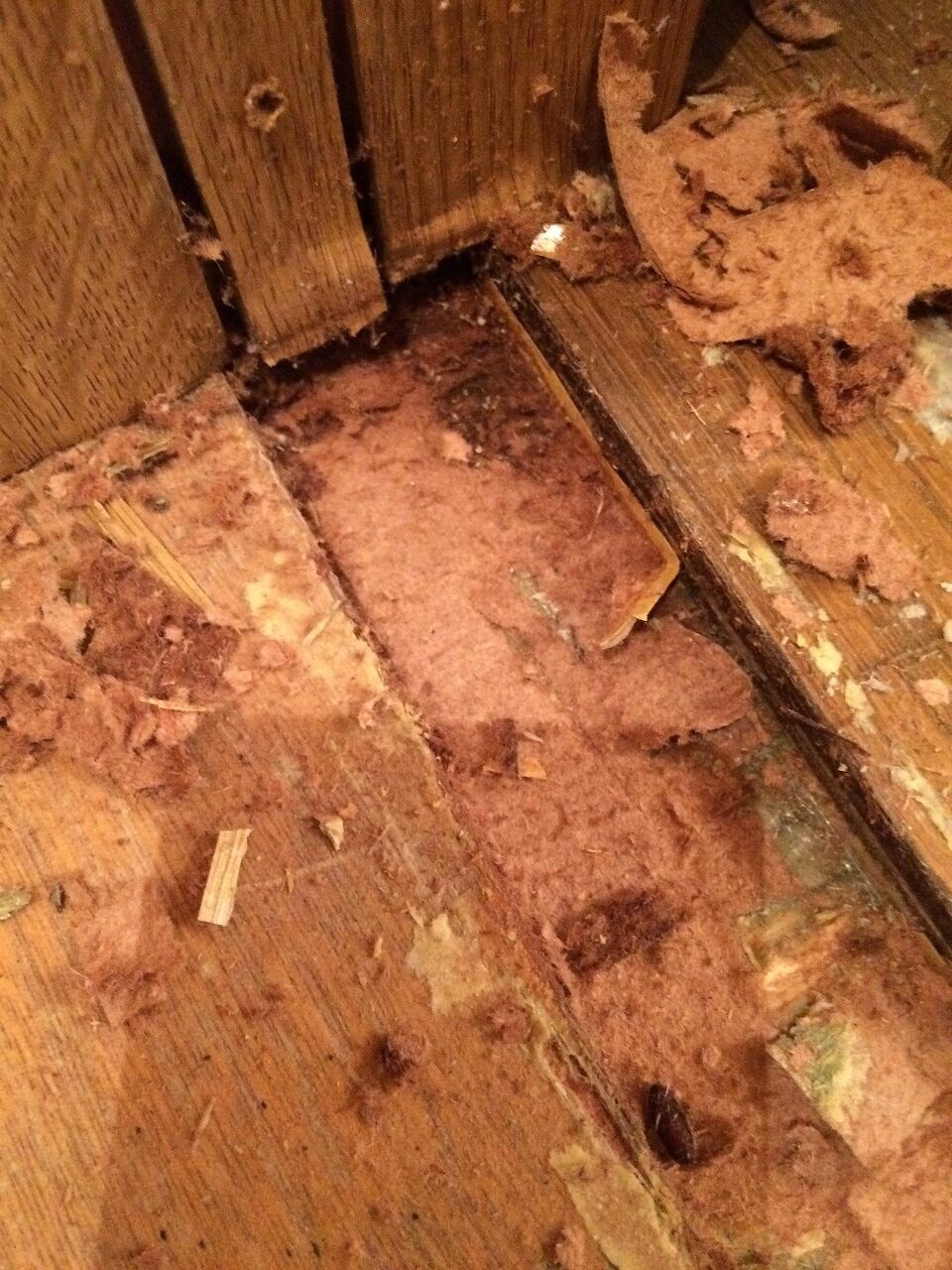クッションフロアの場合、継ぎ目や巾木の隙間から床下まで体液が浸透します。それが腐敗しハエが発生したり悪臭を放ちます。この部分を見逃すと見た目は綺麗でも臭いは消えません。