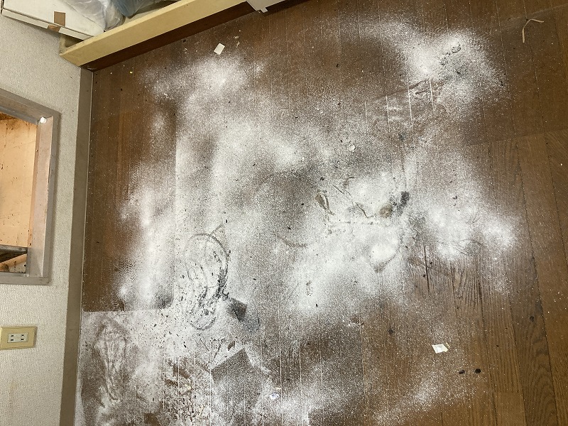発見が遅れたのかかなり広範囲に汚染がひろがり、玄関の外まで異臭を感じるほどでした。